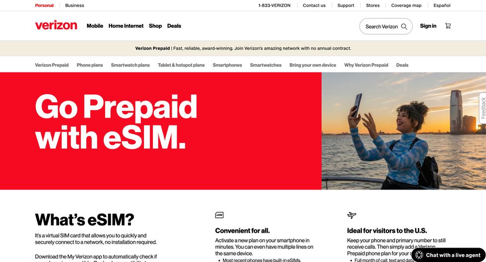 Worked on UX and copy for the Verizon Prepaid eSIM rollout. On mobile, eSIM is displayed in a carousel tile that, when clicked, takes a user to the 'Get started' activation page. From there, a user can go through the flow easily on their smartphone to purchase/activate a new eSIM and phone plan. On desktop, the interaction features a QR code that's intended to foster seamless migration to the app experience for a user to get started.